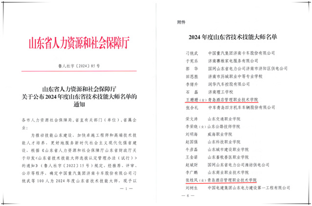 本网讯(组织人事处 教师工作部)近日,山东省人力资源和社会保障厅公布了2024年度山东省技术技能大师名单,sunbet烹饪学院王珊珊、张桂凤2名教师位列其中。截至目前,学校已有4名教师获评“山东省技术技能大师”。