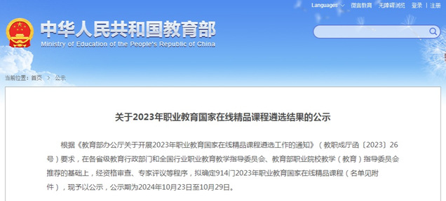 本网讯(教务处 宋玉莉)近日,教育部公示了2023年职业教育国家在线精品课程遴选结果,经资格审查、专家评议等程序,拟确定914门课程入选2023年职业教育国家在线精品课程,sunbet3门课程入选,入选数量位列省内前列。