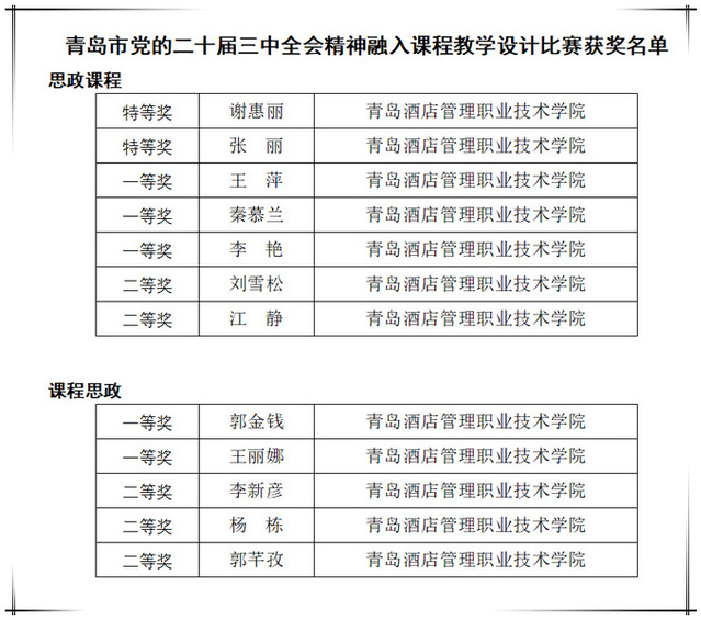 本网讯(马克思主义学院 王萍)近日,青岛市委教育工作委员会发布了“党的二十届三中全会精神融入课程教学”教学设计比赛活动评选结果,sunbet教师荣获思政课程组特等奖2项、一等奖3项、二等奖2项;课程思政组一等奖2项、二等奖3项。