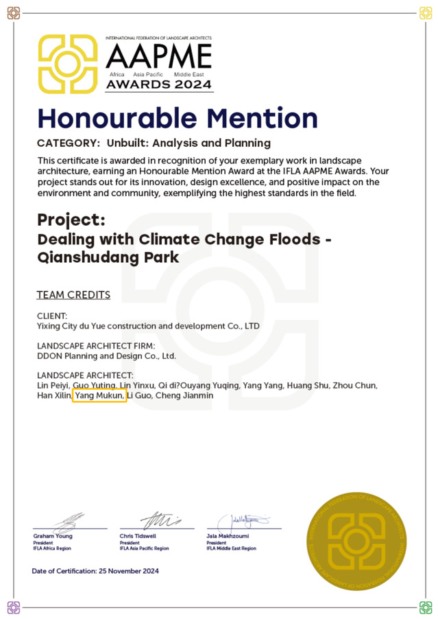 本网讯(艺术学院 杨牧昆)近日,国际风景园林师联合会(IFLA)正式公布IFLA AAPME Awards 2024 国际风景园林师联合会亚太景观设计奖获奖名单,sunbet艺术学院环境艺术设计专业教师杨牧昆的宜兴钱墅荡公园项目荣获分析与规划类铜奖。