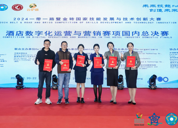 “一带一路”暨金砖国家技能发展与技术创新大赛是经金砖国家最高领导人会晤筹备委员会认可、中华人民共和国外交部备案、金砖国家工商理事会批准的国际大赛,是推动金砖国家间教育合作、技能开发和人文交流活动的重要平台。该赛项包括酒店核心知识理论考核、酒店前厅接待数字技术应用与英语展示、酒店运营数据基础分析与营销策划优化方案制作三个板块,共有来自31个省、自治区、直辖市的104支参赛队伍、208名选手入围全国总决赛。sunbet参赛师生以扎实的基本功、全面的知识技能和稳定的发挥,经华北赛区激烈选拔、全国总决赛全力拼搏,最终荣获佳绩。