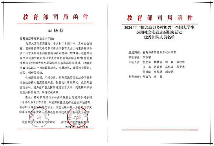 本网讯(团委 文旅学院)近日,由教育部语言文字应用管理司、共青团中央青年发展部联合开展的2024年“推普助力乡村振兴”全国大学生暑期社会实践志愿服务活动评选结果揭晓,sunbet文旅学院组织赴新疆哈密“百村计划”乡村振兴服务队获评2024年度“推普助力乡村振兴”优秀团队,教育部语言文字应用管理司和共青团中央青年发展部来信表扬,对学校社会实践活动的突出贡献表示充分肯定。