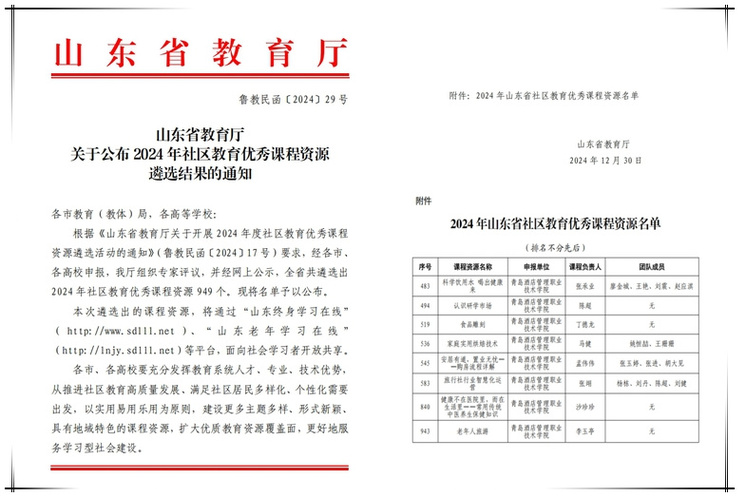 前期,学校根据《山东省教育厅关于开展2024年社区教育优秀课程资源遴选活动的通知》(鲁教民函〔2024〕17号)要求,经过课程申报、内容评审、资料上传等环节,推荐校内社区教育优秀课程资源培育项目参加遴选。经山东省教育厅专家评议并网上公示,全省共遴选出社区教育优秀课程资源949门。sunbet入选的全部课程资源将通过“山东终身学习在线”“山东老年学习在线”等平台,面向社会学习者开放共享。