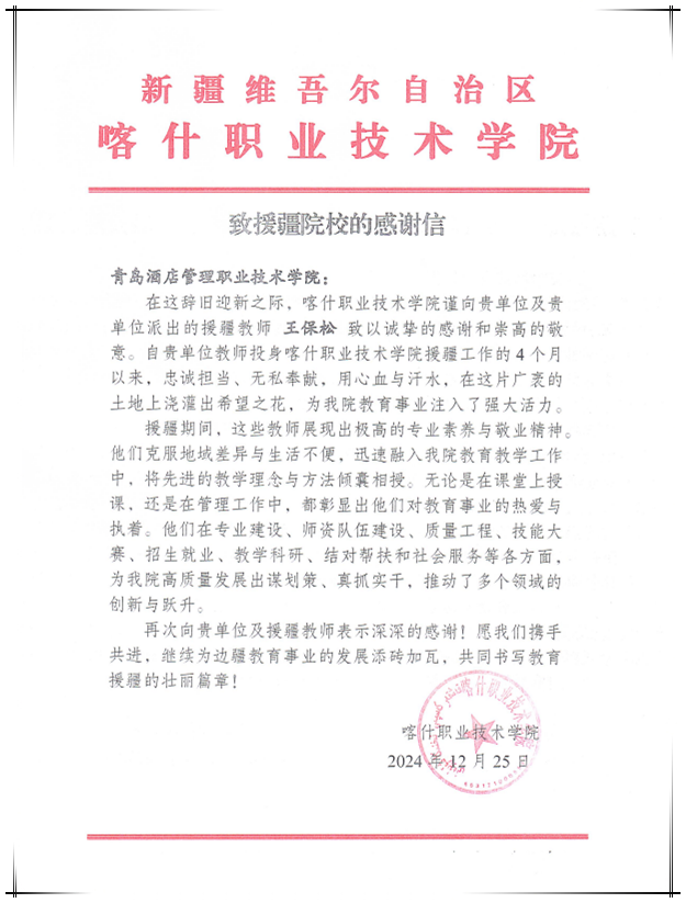 此封感谢信既是对学校前期帮扶喀什职业技术学院工作的充分肯定,又是对援疆教师和后期持续高质量援疆工作的鼓舞和激励。学校将以此为契机,持续推进落实国家教育援疆各项工作部署和整建制托管喀什职业技术学院文化和旅游学院协议的落地,秉持教育初心和使命,为祖国边疆教育事业发展和教育援疆工作贡献青酒管力量。