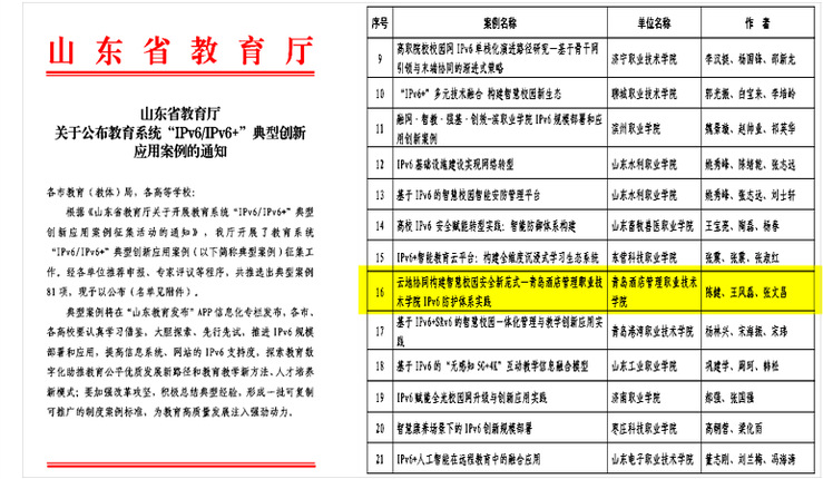 本网讯(教育信息中心 张文昌)近日,山东省教育厅公布了2024年教育系统“IPv6/IPv6+”典型创新应用案例评选结果,学校报送的《云地协同构建智慧校园安全新范式—sunbet申搏官方网站IPv6防护体系实践》入选。