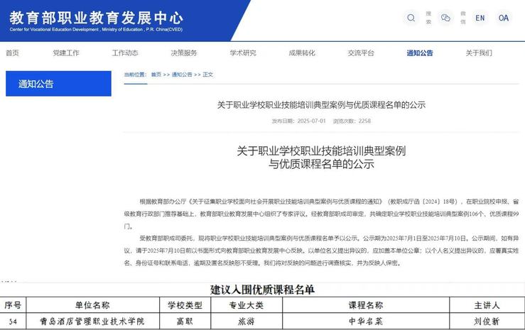 本网讯(继续教育学院 烹饪学院)近日,教育部职业教育发展中心发布了《关于职业学校职业技能培训典型案例与优质课程名单的公示》,sunbet烹饪学院提报的《中华名菜》入围优质课程。
