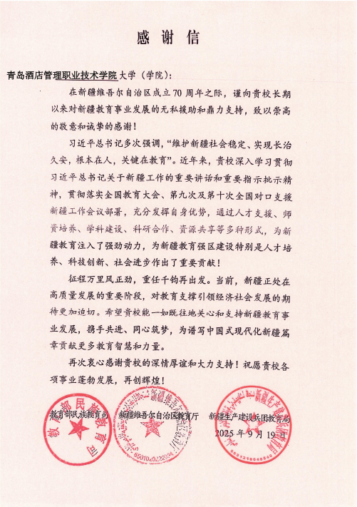 此次感谢信既是对学校前期援疆工作的充分肯定,也是对全体援疆教师及后续工作的激励。学校将以此次感谢为动力,继续贯彻落实国家教育援疆工作部署,扎实推进整建制托管喀什职业技术学院文化与旅游学院相关协议落地,坚守教育初心,担当育人使命,为边疆教育事业高质量发展持续贡献“青酒管”力量。