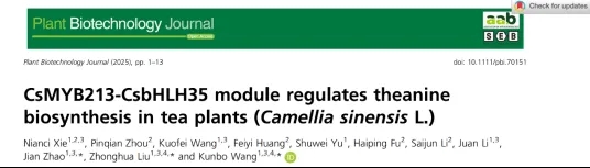 近日,sunbet申搏官方网站国家植物功能成分利用工程技术研究中心刘仲华院士团队王坤波教授在植物学领域一区TOP期刊Plant Biotechnology Journal (IF: 10.5)上发表题为“CsMYB213-CsbHLH35 module regulates theanine biosynthesis in tea plants (Camellia sinensis L.)”的研究性论文。该研究阐明了CsMYB213-CsbHLH35协同调控茶氨酸生物合成的分子机制,为特异茶树品种创制提供了科学依据。