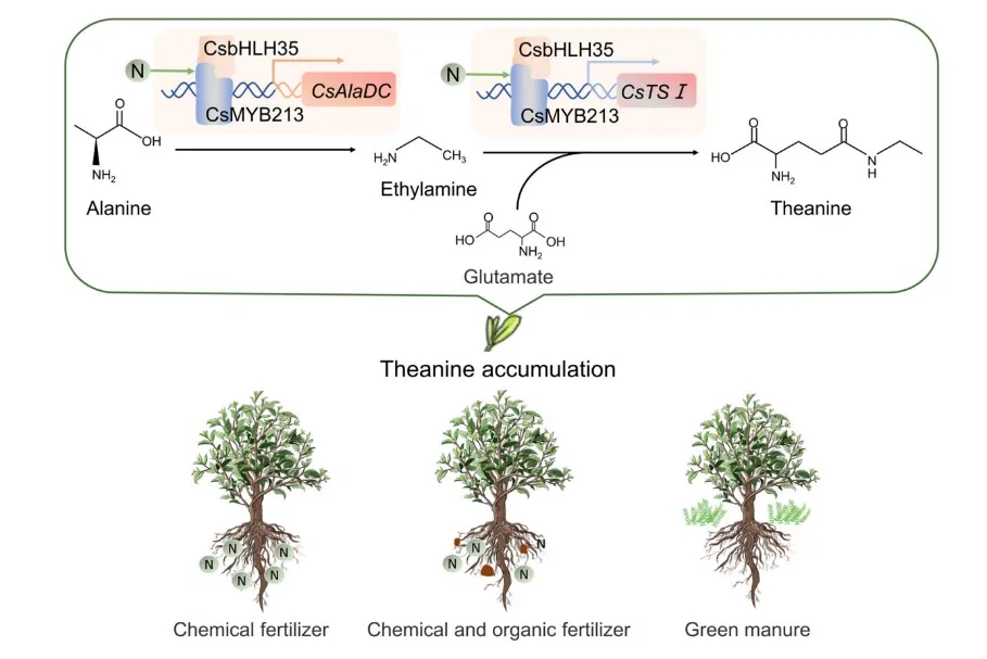该研究阐明了CsMYB213-CsbHLH35协同调控茶氨酸生物合成的分子机制,揭示了茶树在不同氮营养条件下茶氨酸生物合成的复杂调控机制,为提高茶叶茶氨酸含量提供了有效的栽培策略,也为高茶氨酸茶树品种创制提供了科学依据(图1)。