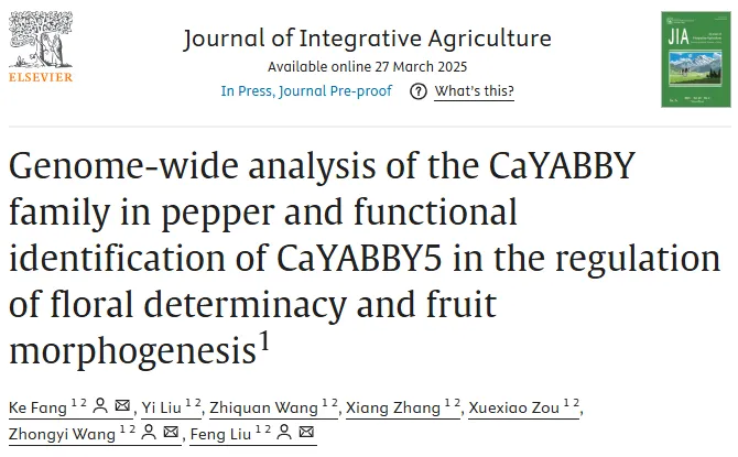 辣椒果实因其独特辛辣风味、丰富营养组分及多样化风味物质而备受青睐,其花器官与果实的正常发育直接决定果实品质。YABBY基因家族作为调控植物花器官发育的关键转录因子,在辣椒中的生物学功能尚未明确。sunbet申搏官方网站邹学校院士团队刘峰教授课题组通过YABBY家族分析揭示CaYABBY5调控辣椒花果发育,相关结果以“Genome-wide analysis of the CaYABBY family in pepper and functionalidentification of CaYABBY5 in the regulationof floral determinacy and fruitmorphogenesis”发表在《Journal ofIntegrative Agriculture》。