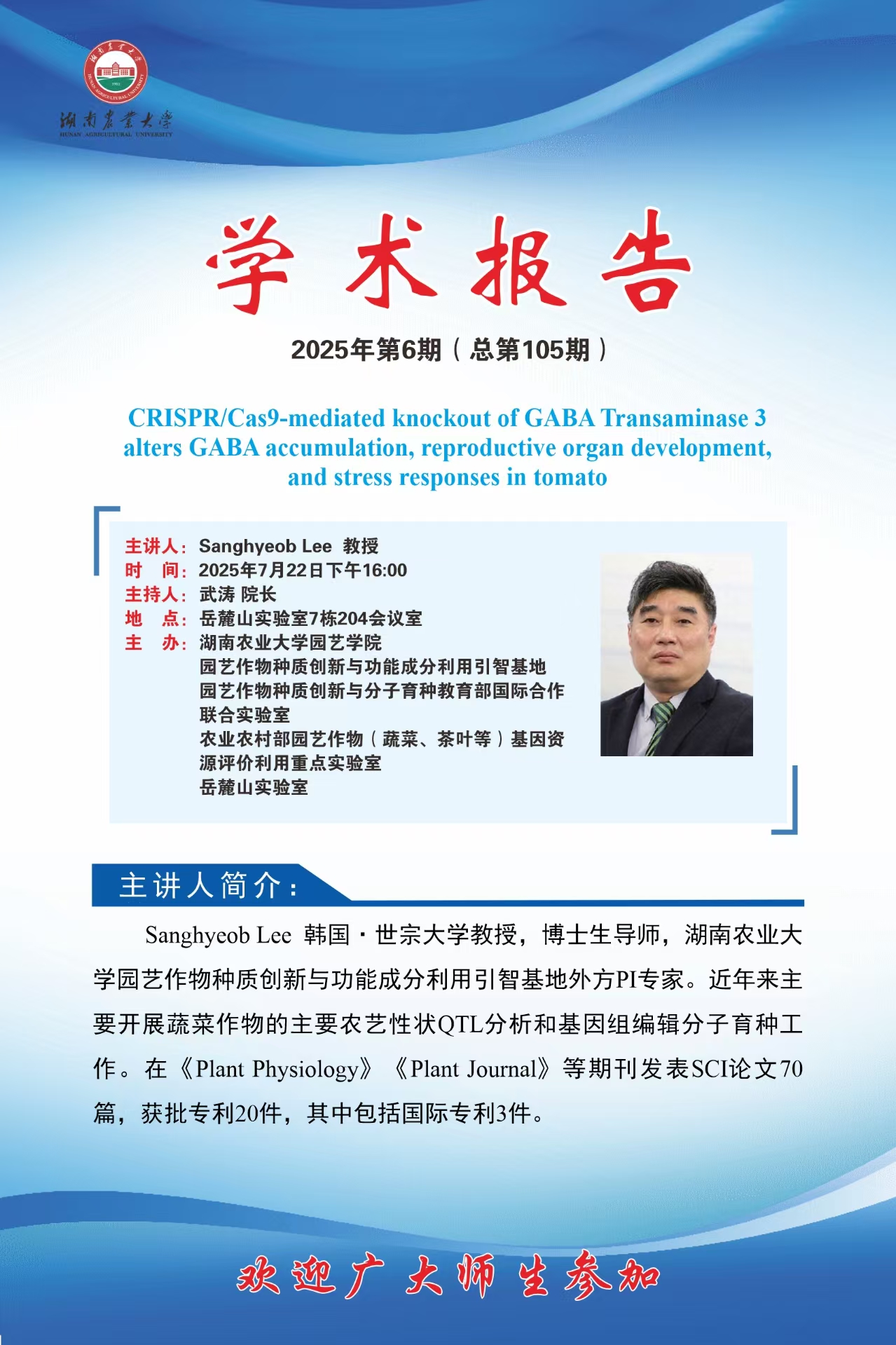 园艺讲坛第105期-名师讲坛:CRISPR/Cas9-mediated knockout of GABA Transaminase 3alters GABA accumulation, reproductive organ development,and stress responses in tomato
