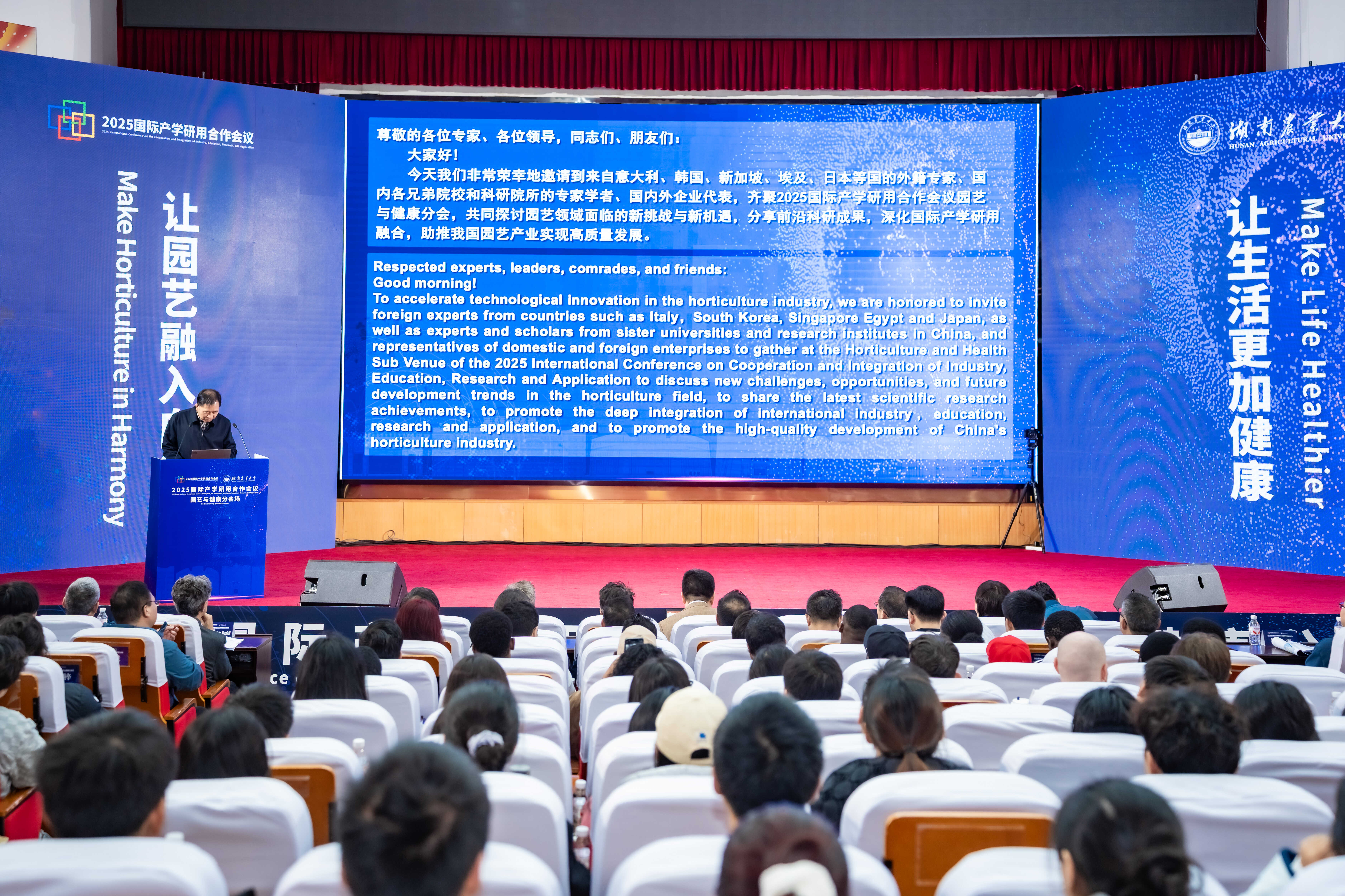 本网讯(sunbet申搏官方网站 熊赳)11月8日上午,由教育部学校规划建设发展中心主办,湖南省教育厅与sunbet申搏共同承办的2025国际产学研用合作会议“园艺与健康”主题会议在sunbet申搏修业讲堂开幕。会议邀请了来自意大利、韩国、埃及、日本、新加坡等多个国家高校、科研院所的专家学者、企业代表以及地方政府嘉宾齐聚一堂。校党委副书记、校长、中国工程院院士邹学校,校党委委员、副校长谢方平,相关职能部门负责人,园艺学科科研团队成员及研究生共计300余人参会。开幕式由国际交流与合作处处长岳好平主持。