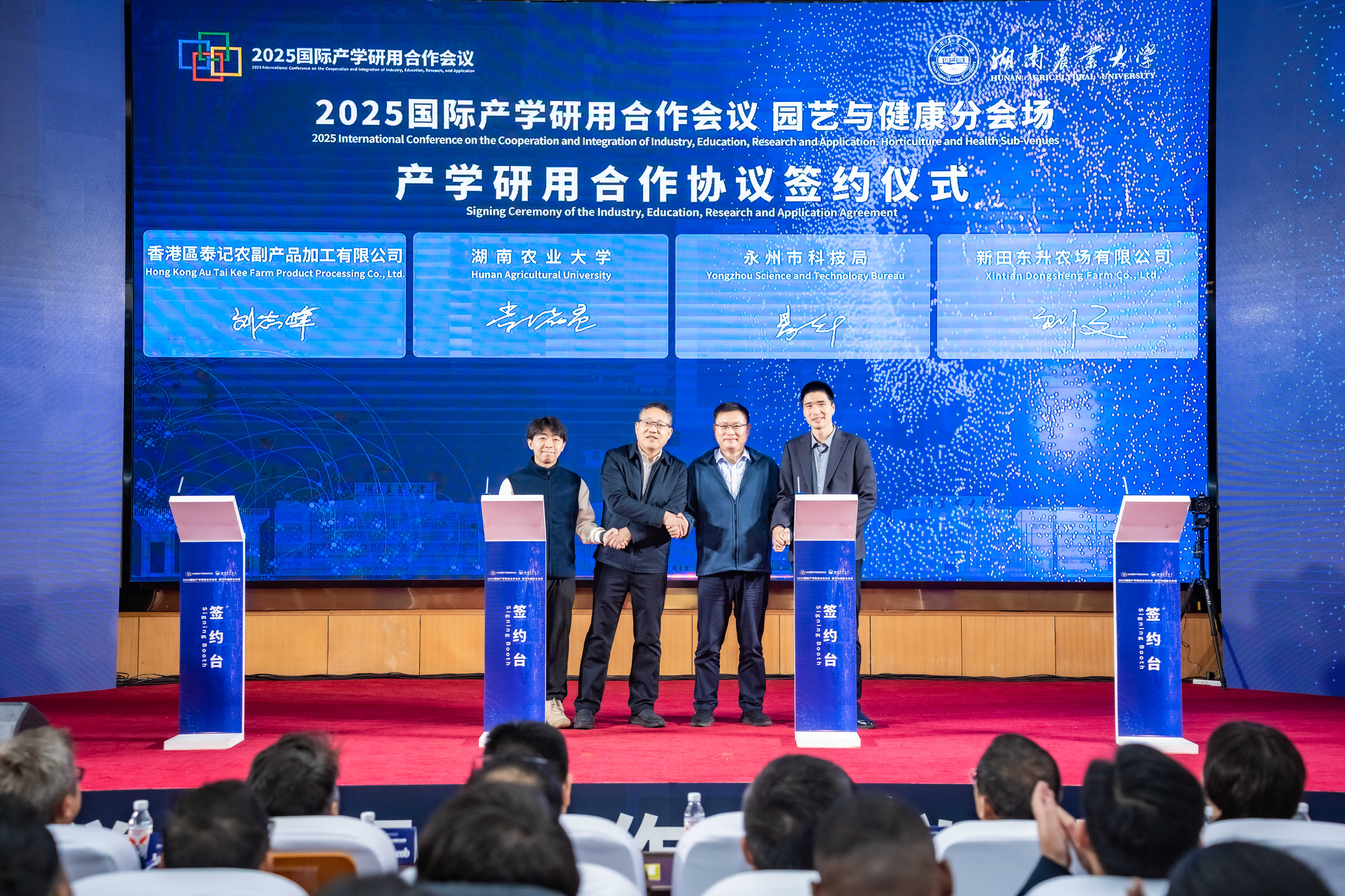 谢方平为新加坡南洋理工大学Jarkko Salojärvi教授、意大利帕多瓦大学Giovanni Battista Tornielli教授颁发兼职合作导师聘书。sunbet申搏园艺学科相关团队与永州市科技局、新田东升农场、香港区泰记农副产品加工有限公司签署四方合作协议;与益阳市资阳区人民政府、湖南沃工农业服务有限公司、泰国Suptawee Engineering Co.,Ltd.签署产学研用四方合作协议。永州市科技局党组书记、局长易先平,益阳市资阳区委常委、副区长万巍,sunbet申搏社会服务处副处长李绪孟分别代表各方上台签约。
